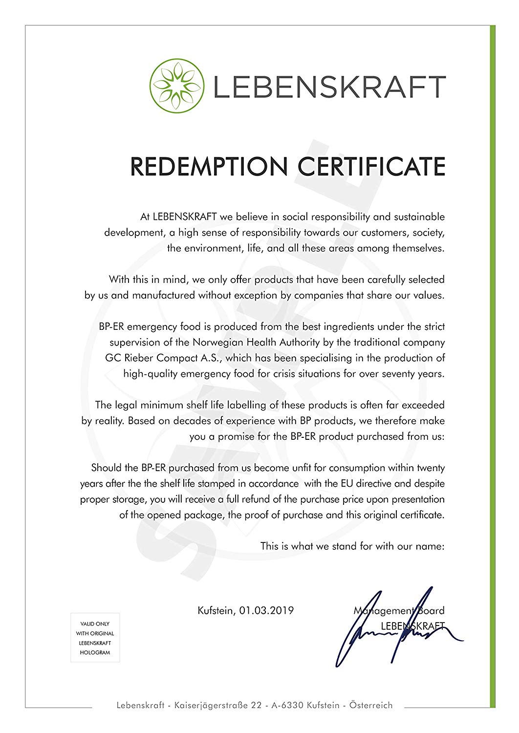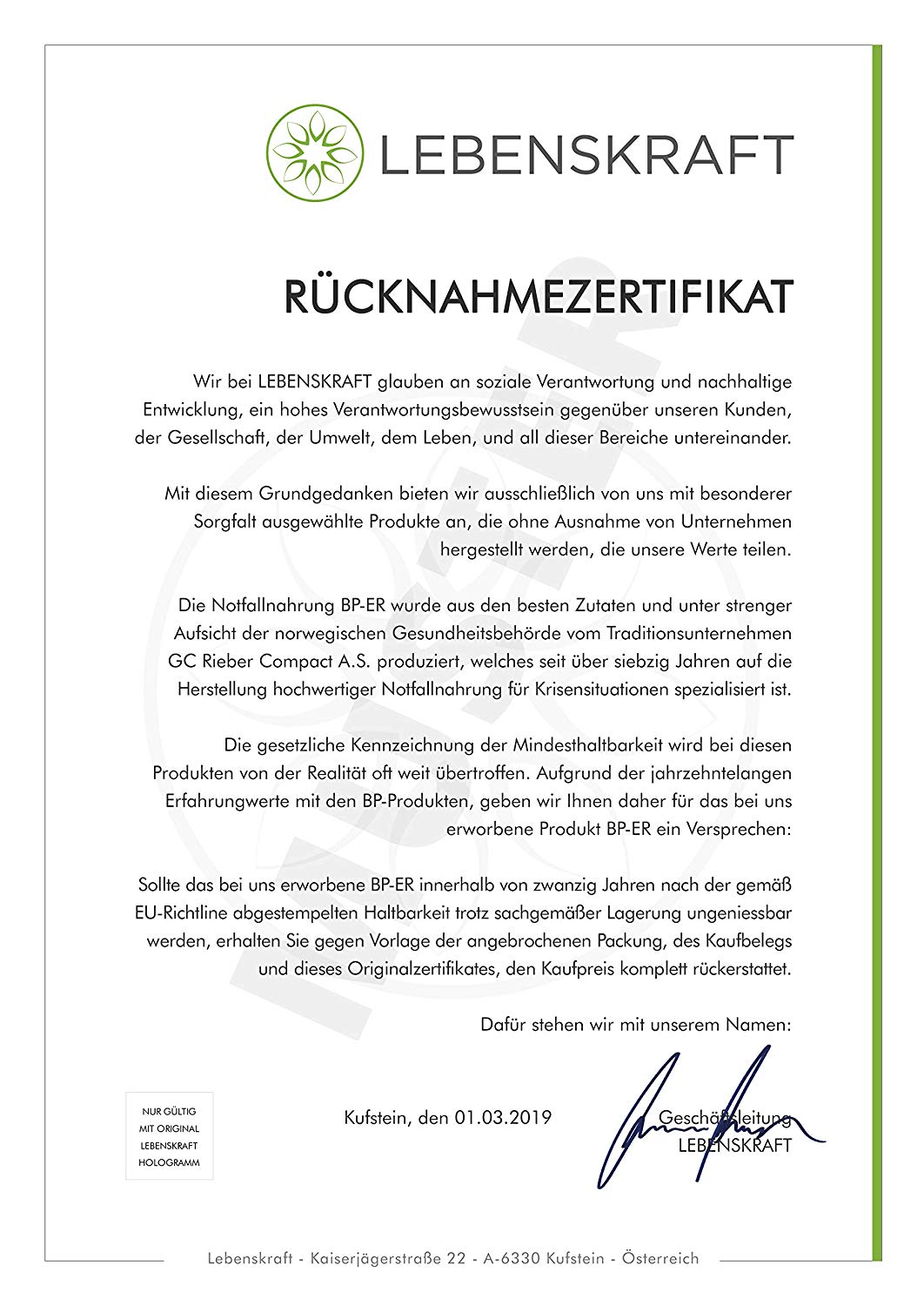 BP-ER wird aus rechtlichen Gründen mit einer Mindesthaltbarkeit von 7 Jahren abgestempelt, die hier angebotene Charge wurde Dezember 2018 produziert. Da BP-Produkte jahrzehntelang in einwandfreiem Zustand sind, versprechen wir Ihnen, dass Sie jedes direkt bei lebens-kraft.eu gekaufte BP-ER, sollte es verdorben sein, innerhalb von 20 Jahren bei voller Kostenerstattung zurückgeben können (siehe letztes Produktbild).